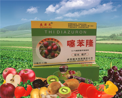 益果灵牌噻苯隆是咸阳德丰公司研制生产的一种新型植物生长调节剂,有极强的生物活性,其诱导植物细胞分裂、组织愈伤能力比激动素高数百倍。它能解除基因阻遏,开启DNA和RNA的密码,引发有关酶及蛋白质的合成,协调植物内源激素的分泌,并能诱导植物SAR(系统抗性)基因的表达,增强抗病及抗逆能力。在农业生产上对人、畜安全,对飞鸟、天敌、蜜蜂、蚕、鱼无毒,对生态环境无污染,在果实中无残留,为绿色无公害农药。
